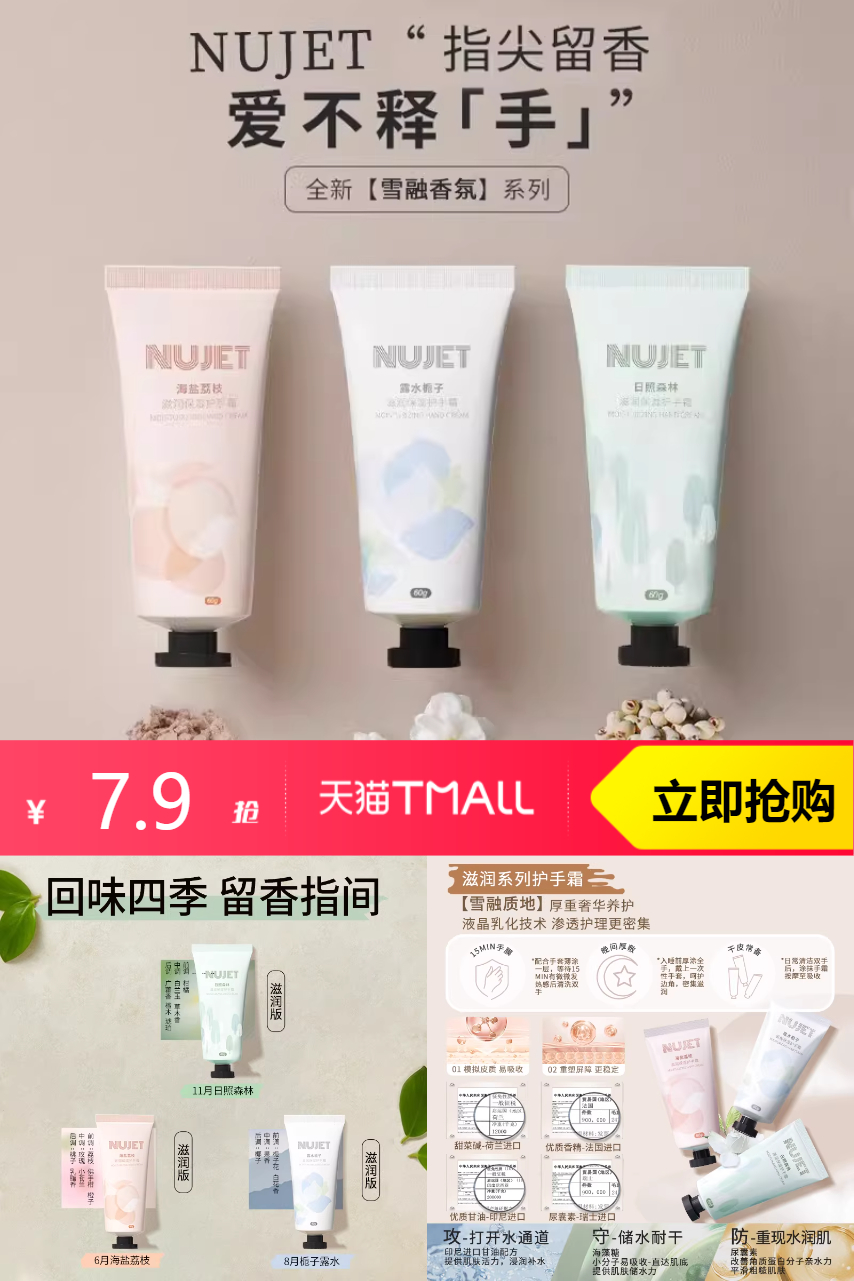 【淘金币减0.39元,到手价7.51元。】NUJET雪融香氛,呵护你的双手!精华护手,滋润不油腻,清爽舒适!护手霜新选择,NUJET,守护你的娇嫩!