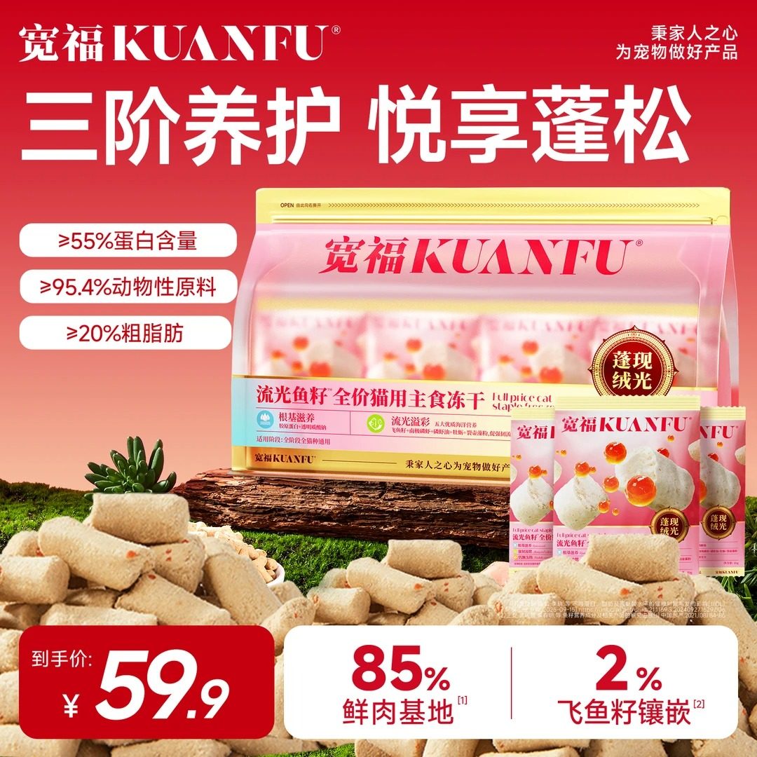 惊喜来啦!宽福推出猫咪美食——流光鱼籽生骨肉全价猫粮,2%飞鱼籽镶嵌,95.4%动物性原料,营养丰富,适合各种年龄段的猫咪。现在购买还有机会获得试吃装,让你的小宝贝尝尝鲜!