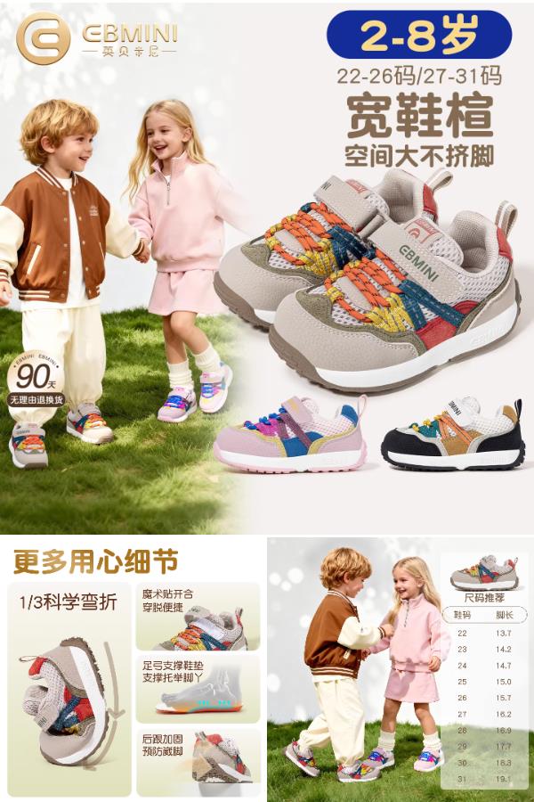 英贝米尼2026春季新款阿甘鞋,彩色活力设计+加宽鞋头+透气网布,专为儿童足弓发育科学打造,不挤脚、不闷汗、跑跳更自在~190.9元享高端童鞋品质!同款商场标价399元起,春日轻盈出行高性价比之选!让宝贝迈出自信每一步的舒适选择,就在眼前!