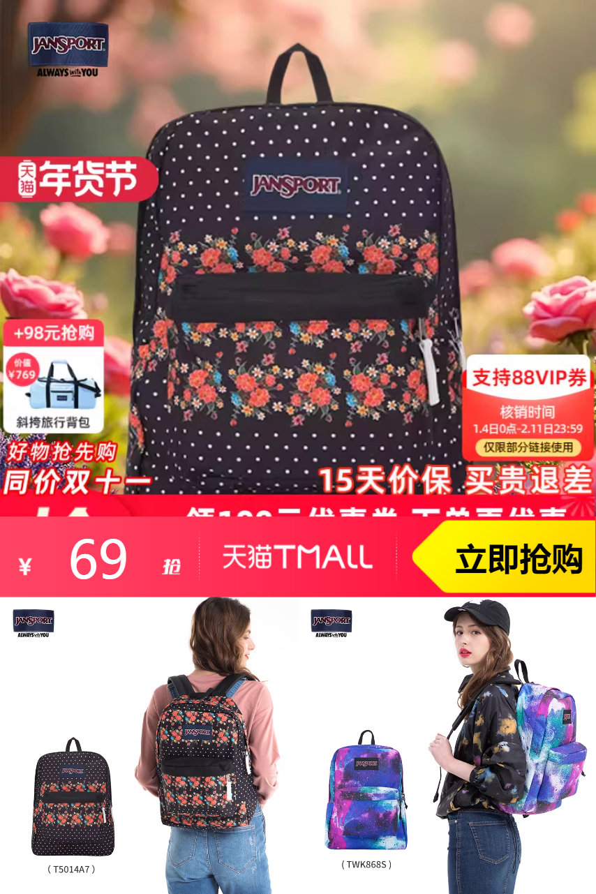 【叠加4元淘金币到手65元】到手价惊喜不断!这款JanSport双肩背包采用时尚印花设计,轻便耐用,适合高中女生和男生日常通勤、户外活动。大容量空间轻松容纳笔记本电脑与日常用品,是学生党和上班族的理想选择。高品质面料与细节做工相结合,打造舒适背负体验。快来抢购,享受高性价比的潮流出行装备!