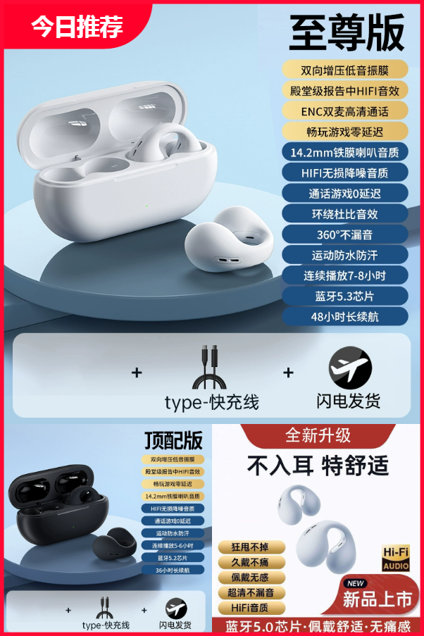 全新升级,不入耳 特舒适。记忆回弹钢丝,狂甩不掉,亲肤硅胶材质,佩戴无感,久戴不痛。定向传音,超清不漏音,12mm铁膜圈,HiFi高清音质。