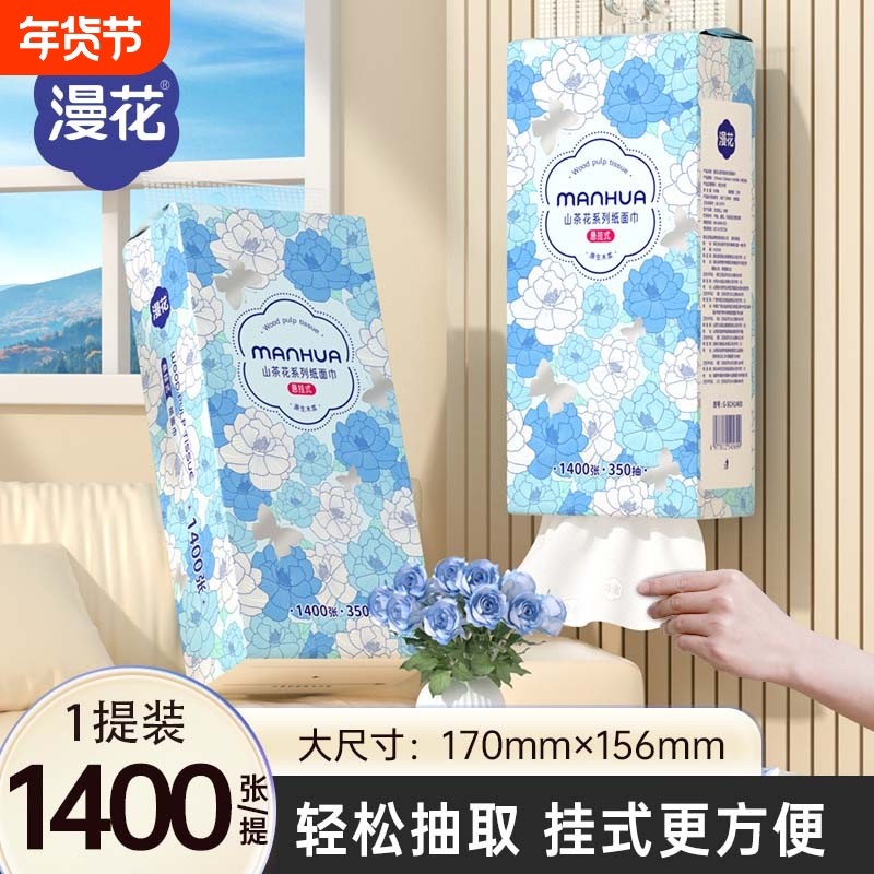 漫花品牌的悬挂式抽纸,采用原生木浆制作,为您提供优质卫生体验。实惠装的设计适合家庭使用。