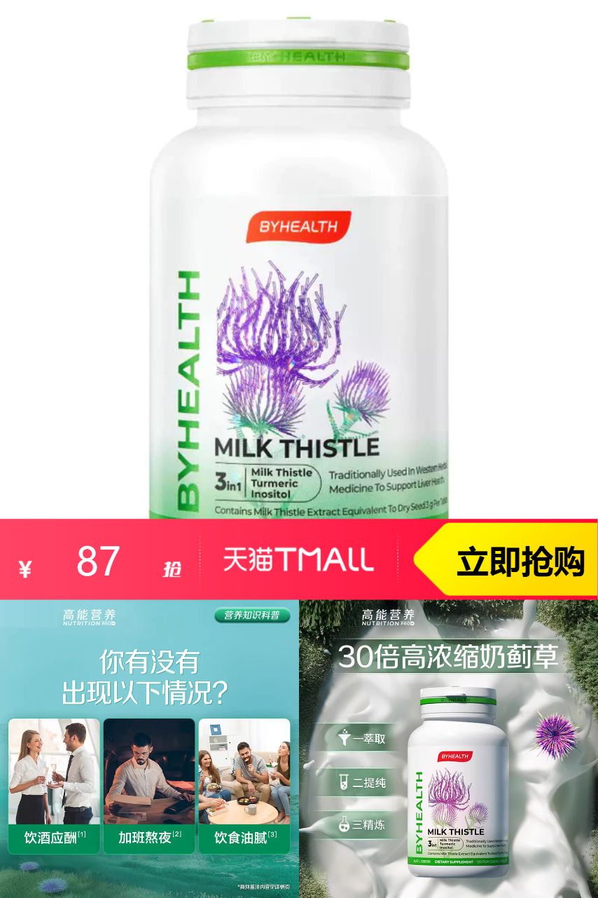 【原价264-官方立减32-直降90-优惠券55-88vip4.35-淘金币7.92=到手价74.73,叠加消费券到手65.3左右,】BYHEALTH汤臣倍健奶蓟草180片,护肝养肝好帮手,适合熬夜、应酬人群。淘金币可用,健康必备!