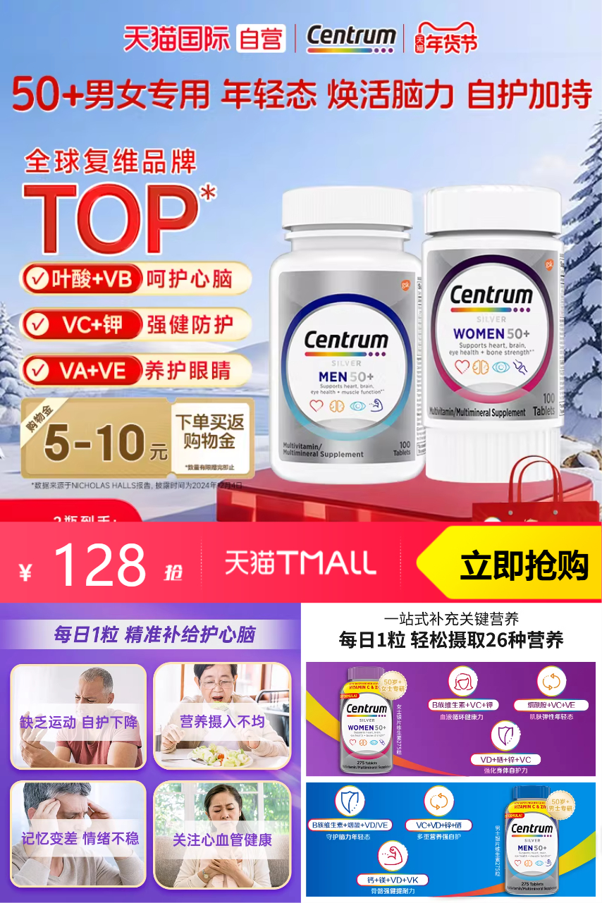 【有16减15新客券,详情页点淘金币加购120粒,88vip叠加新客券15+淘金币14.31+88vip折扣5.65+88折消费券9.49到手83.55!】我们的复合维生素包含了多种人体必需的矿物质和维生素,男女通用,健康无界限。