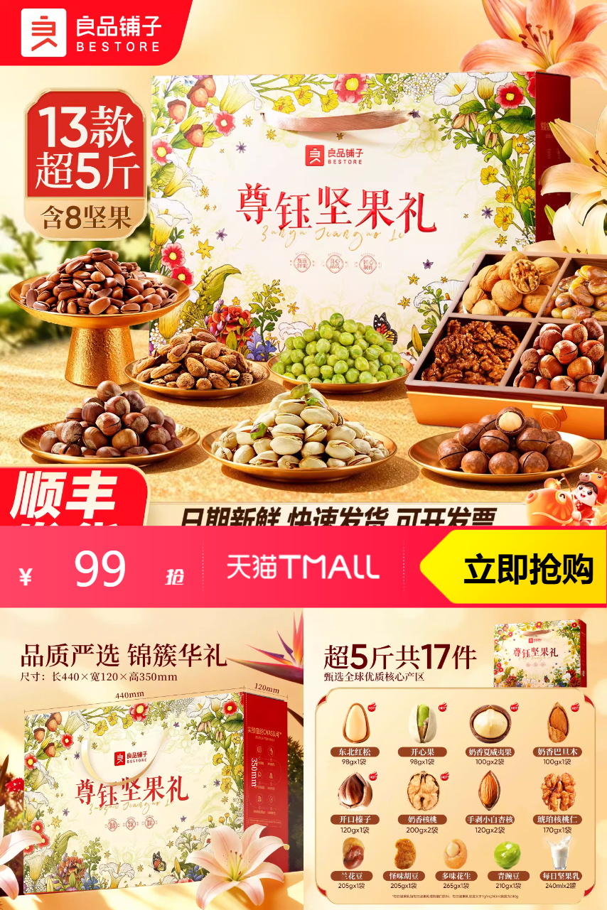 【百补到手价99元】良品铺子新年礼盒尊钰健康礼2791g,精选坚果零食,送礼走亲皆宜!年味满满!