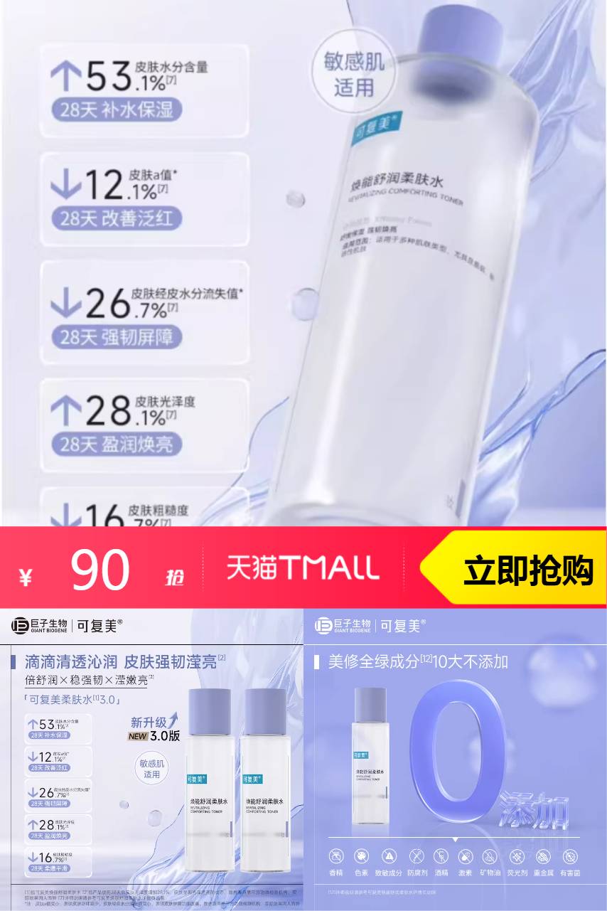 【叠加88vip95折抵扣4.5元+淘金币11.61元+凑消费券200-25抵扣9.23元+政府补贴5%抵扣3.23元=到手仅需61.42元】可复美爽肤水柔肤水500ml,滴滴清透沁润,皮肤强韧盈亮。专攻干·敏·暗,一瓶润·舒·亮。可复美柔肤水数据认证:,第三方权威机构仪器实测,见证皮肤状态多维改善。配合淘金币补贴活动,入手更显实惠,是换季补水的实用之选。