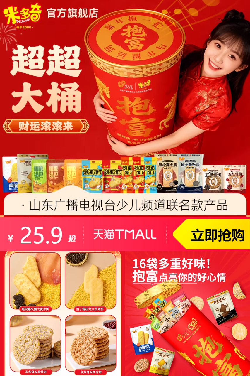 米多奇烤馍片雪饼巨型桶1.6kg,烘焙非油炸、无添加,天然食材健康无负担。它的烤馍片香脆口感和雪饼的柔软结合,既可解馋又不失营养。