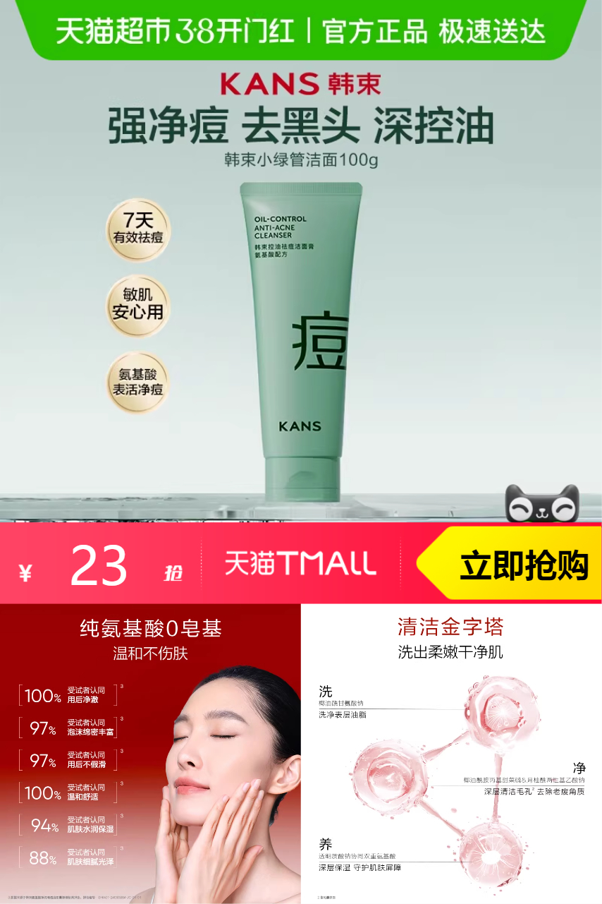 【拍3叠淘客券,有闪购红包3元,到手29.3元,这个9.7元左右/支】【韩束任选3件】韩束控油洁面100g,品质优选。