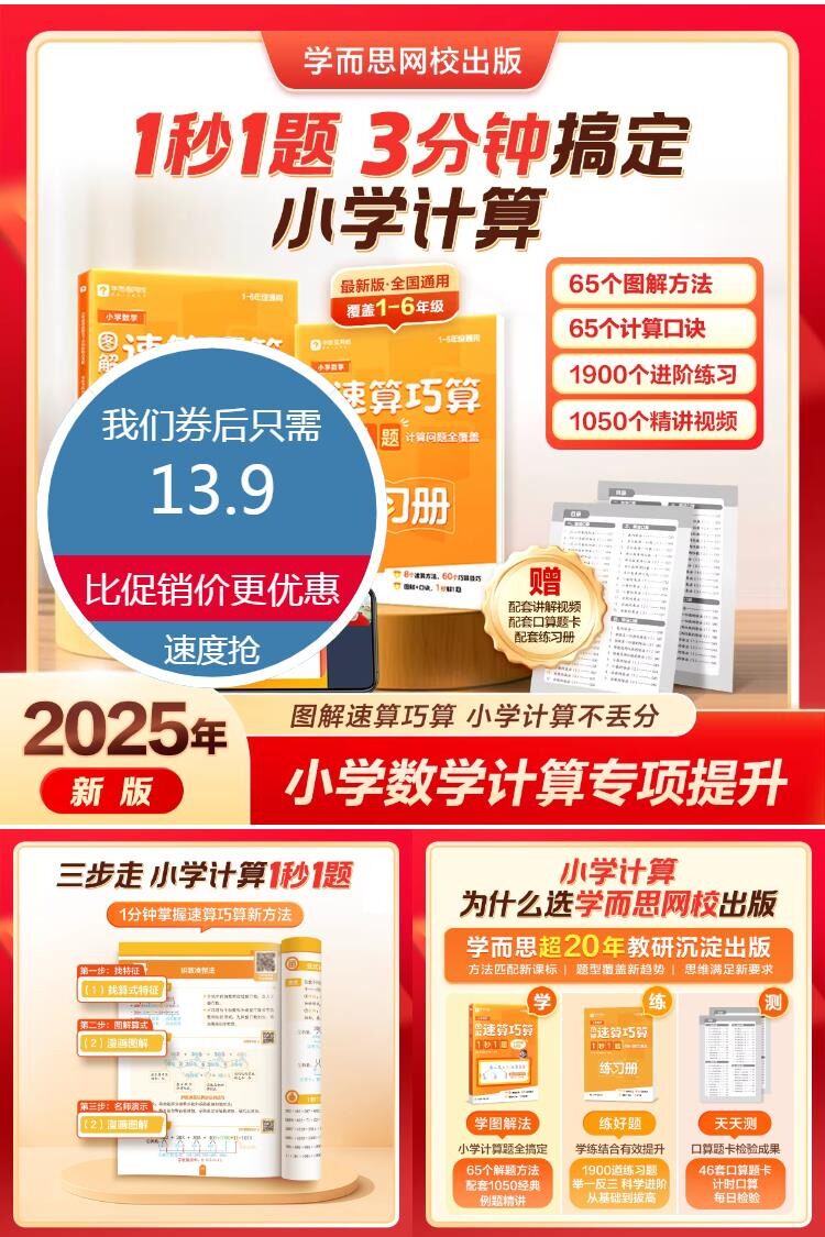 【赠口算题卡+练习册+讲解视频】学而思网校小学数学速算巧算1秒1题练习册,65个图解方法+65个计算口诀+1900个进阶练习+1050个精讲视频,图解速算巧算,小学计算不丢分!