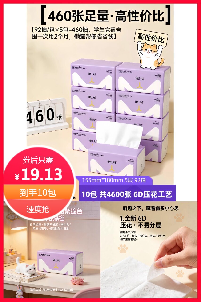 淘金币后到手约15.7元,到手10包,4600张,5层加厚,柔韧不掉屑,湿水不易破,细腻亲肤不刺激,6D压花,猫爪印,细节里的萌趣