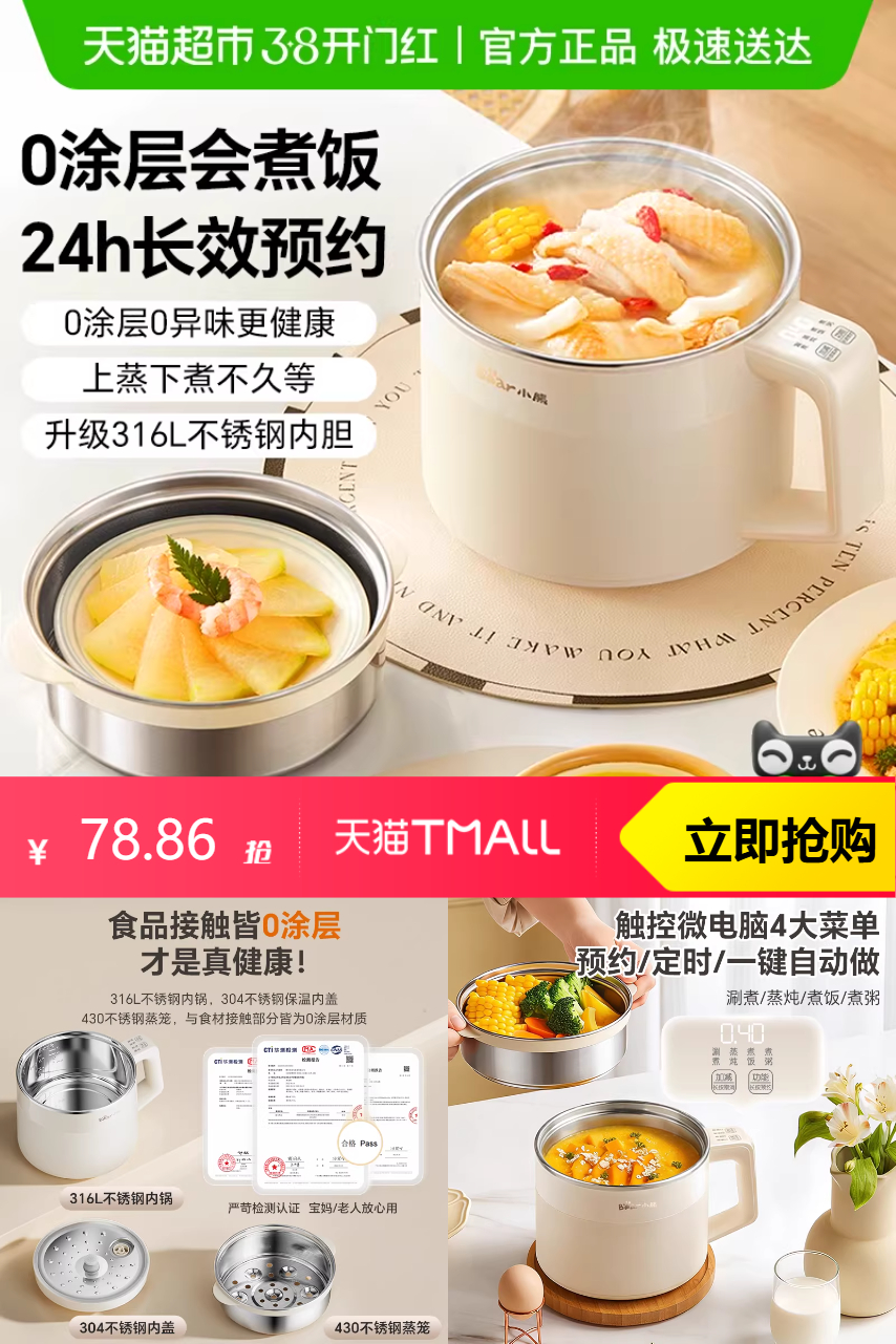 【官方立减50,10元类目券,88VIP减6.95,淘金币抵扣15.92,满200减25消费券减14.49,地补13.92,礼金减8.86,好ping猫卡5元,到手价73.86】小熊电煮锅不锈钢小型多功能电饭煲,品质优选。