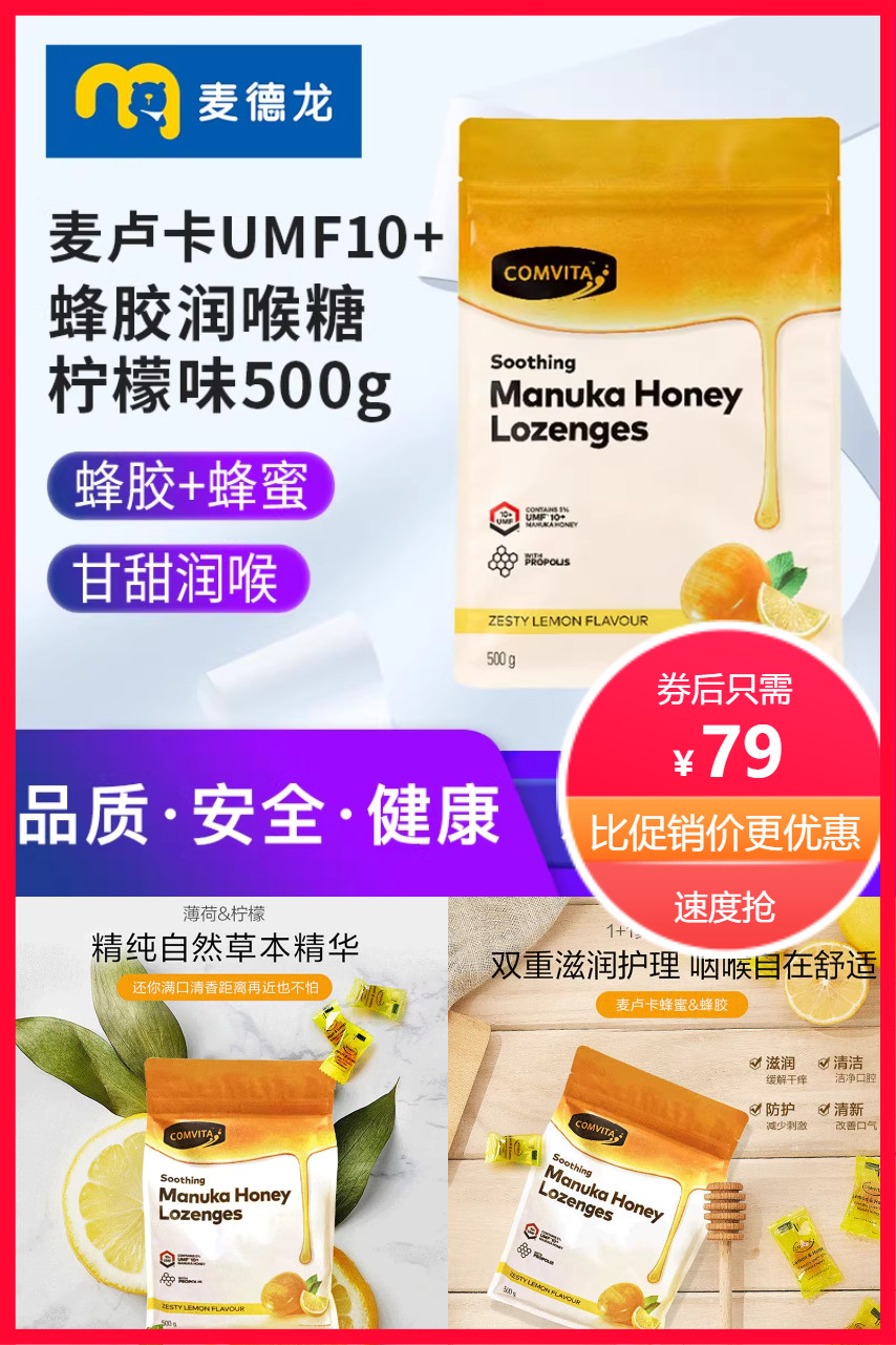 【首单+淘金币+红包+VIP用户可凑品类券200-25到手约64元】麦卢卡UMF10+蜂胶润喉糖柠檬味500g,包中常备,清润舒嗓,镇静滋养,缓解咳嗽,洁净口腔,清新口气。真效润护咽喉,改善不适状态!