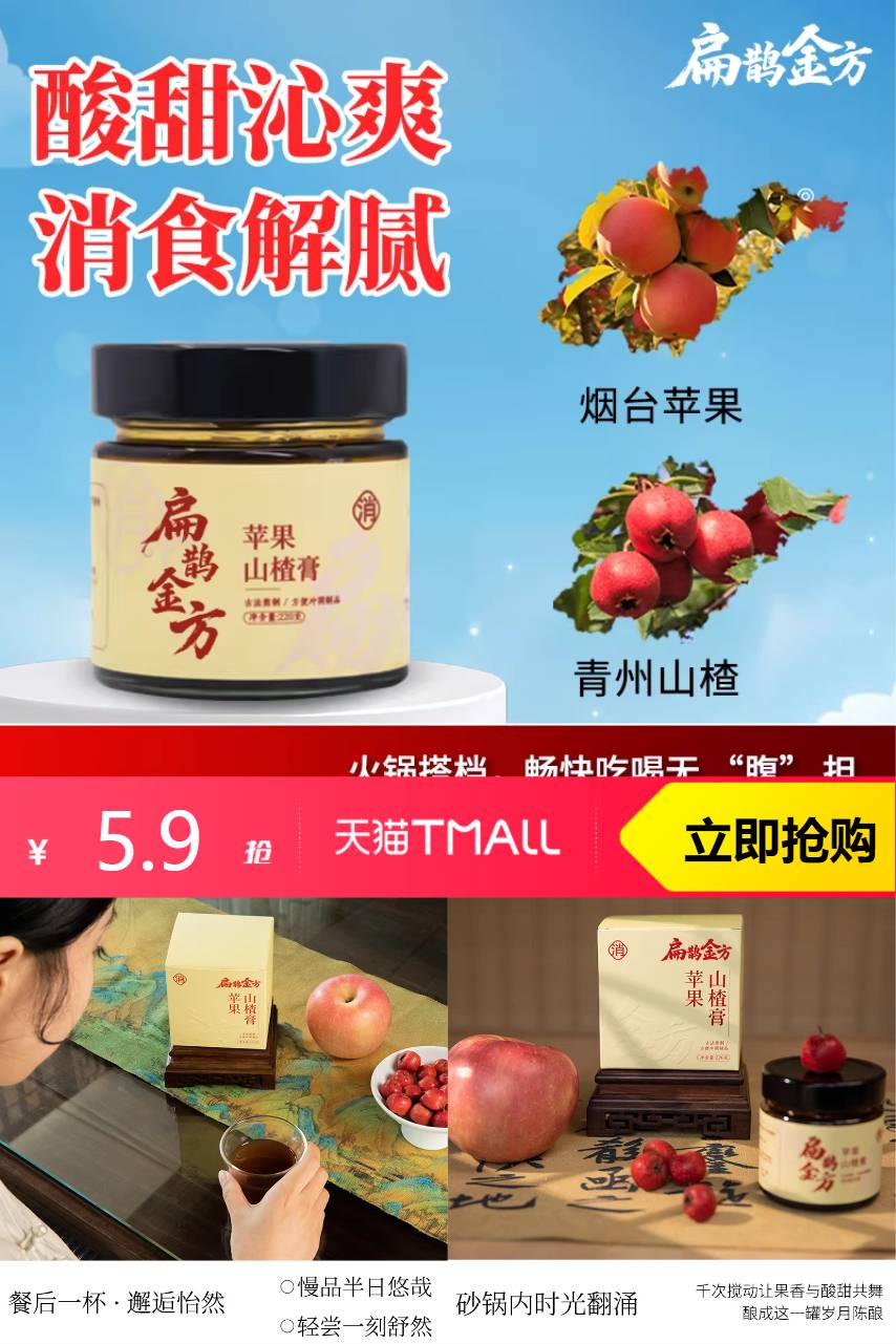 【减淘金币0.4元,到手价5.5元。】扁鹊金方古法熬制苹果山楂膏,5.9元/瓶限时特惠!纯天然配方,养颜又养生,每日一瓶,元气满满。健康之选,品质保障,快来抢购!