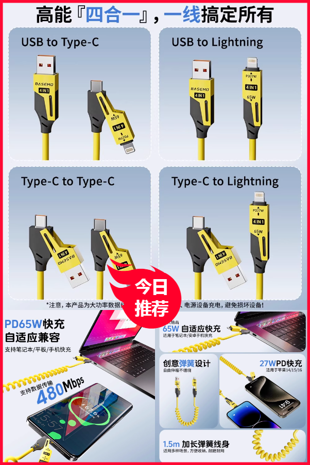 四合一弹簧数据线,手机/笔记本/车载自由伸缩,方便收纳,出差旅行一条就够。创意弹簧设计自由伸缩不缠绕。车载Carplay充电传输两不耽误。