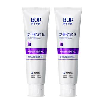 告别黄牙,焕发自信笑容。全新bop抗菌肽美白牙膏,采用生物抗菌肽技术,深层清洁,有效去除牙菌斑,让您的牙齿恢复光洁如新。每瓶含100g,适合家庭使用,让你每天都能拥有白皙亮丽的笑容。