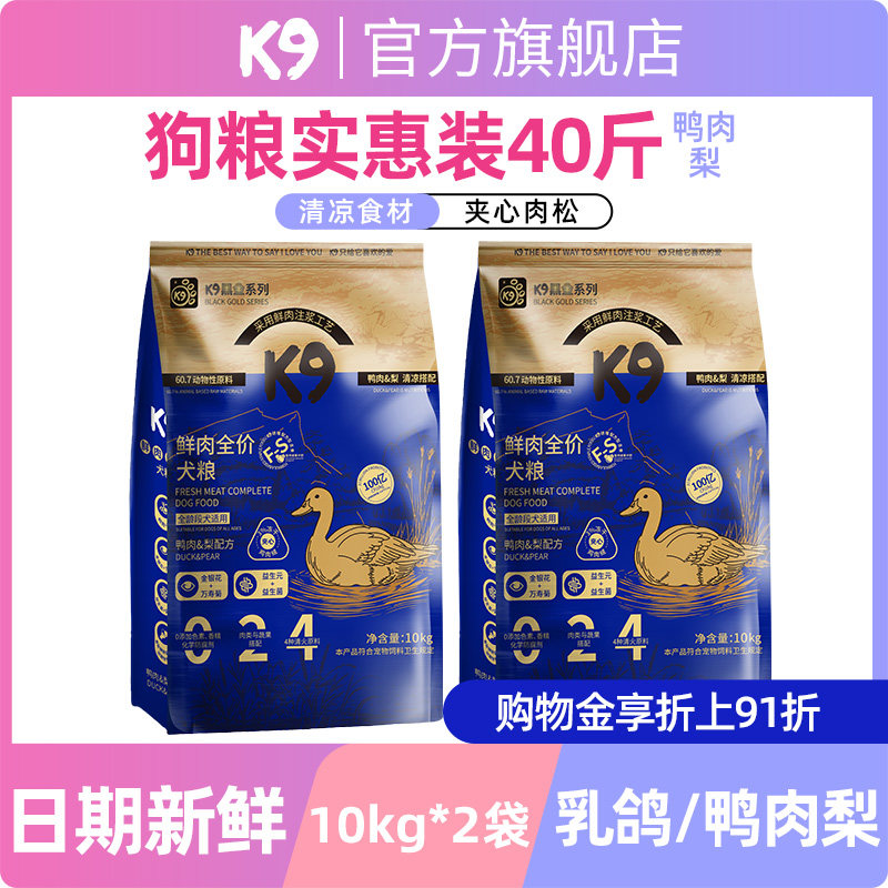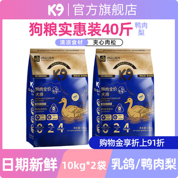 【高品质选择】K9旗舰店推荐K9狗粮40斤装,精选鲜肉为原料,营养均衡,适合所有犬种食用。肉松夹心的设计,不仅美味可口,还能够有效缓减狗狗的泪痕,呵护狗狗的肠胃健康。无论是大型犬还是小型犬,都能享受这份美味与关爱。
