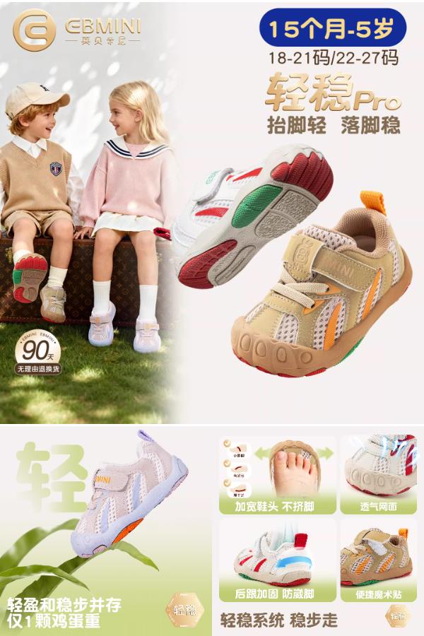 英贝米尼春季新款学步鞋,宽楦设计+轻稳底科技,专为学步期宝宝足弓发育科学护航!155.9元享高端机能童鞋!抗菌内里+防滑软底+360°柔韧弯折,品质不输千元款!宝宝迈出自信步,就从这双开始!