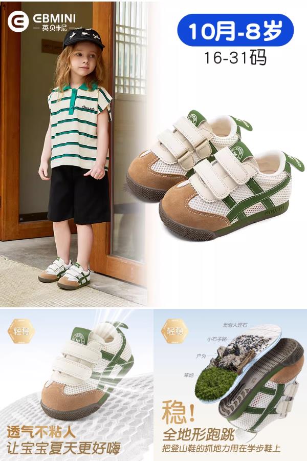 英贝米尼学步鞋专为0-3岁宝宝设计!超软硅胶防滑底+透气网布+宽圆头,稳走不绊脚,呵护足弓自然发育~155.9元享高端婴童品牌品质!轻若无物、弯折自如,春夏季清爽上脚不闷汗~小脚丫的专业学步鞋,等你来选!