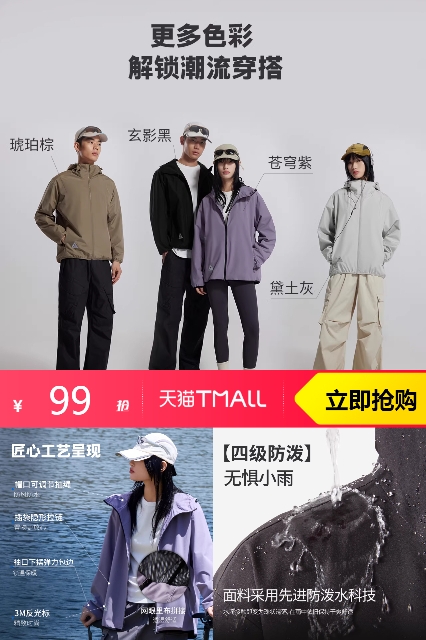 【超低价! 库存有限!单品券+ 淘金币+ 消费券+ 首单/回购礼金35 到手50.46元!】美特斯邦威男女同款夹克防水防风运动连帽,连帽设计,简洁大方。