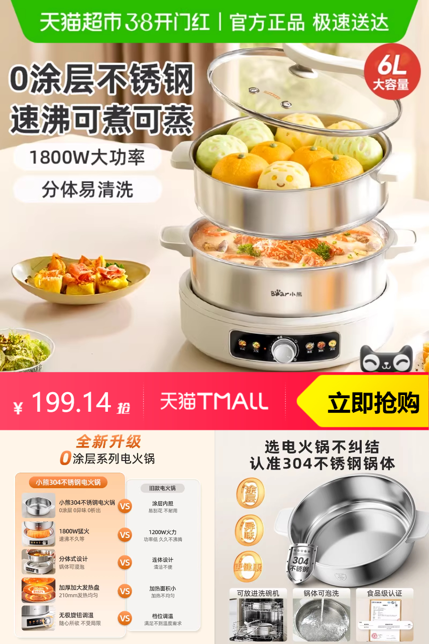 【官方立减140,淘金币减24.5,满200减25,礼金减10.36,好ping猫卡20,到手价179.14】小熊电火锅不锈钢家用电蒸锅分体式,品质优选。