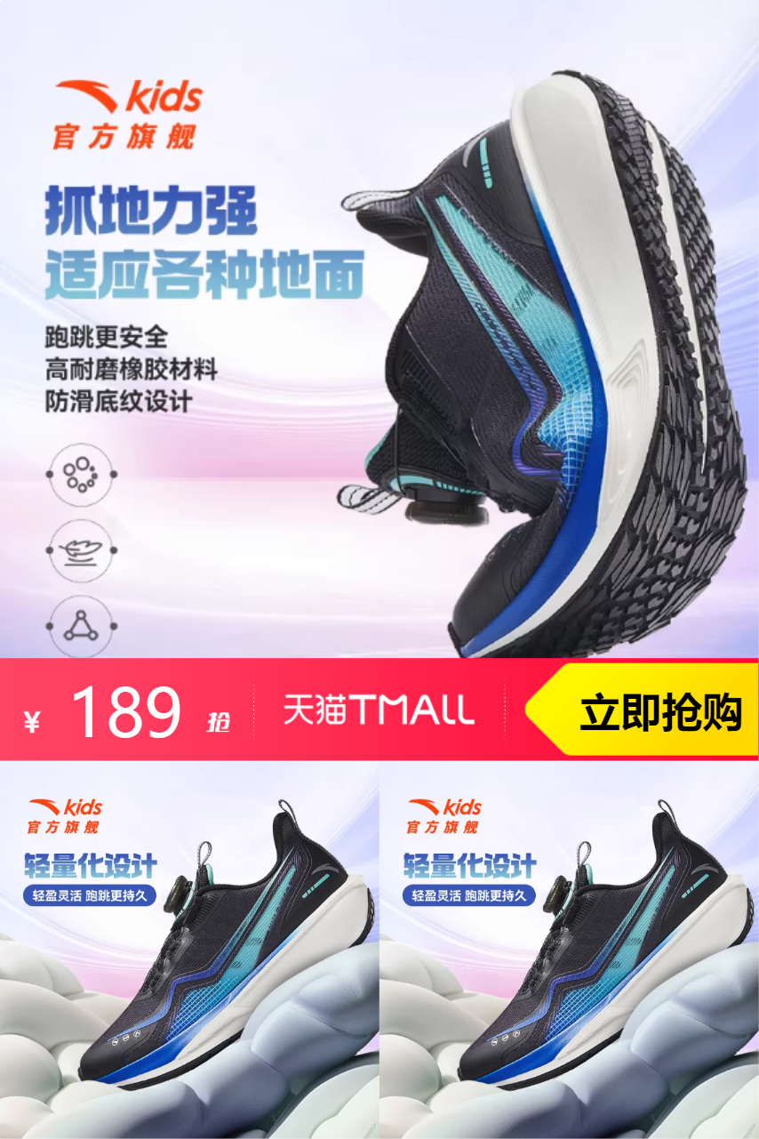 【早上10点开始有20%礼金抵扣37,可凑200-25消费券抵扣22,最终到手130左右,得物197元起步!】【氢跳】安踏2026春季男大童透气跑步鞋,轻盈灵活,跑跳更持久。