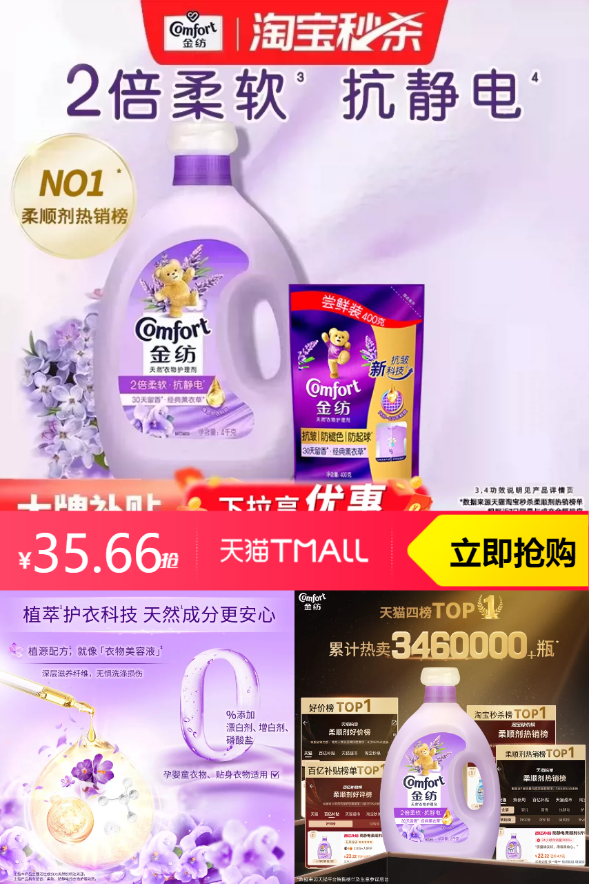 【秒杀渠道叠加0.52淘金币跳转停留几秒根据提示到秒杀首页,秒杀加补到手35.66,直接到手10.4斤】金纺衣物护理柔顺剂,香香软软防静电,萃取自然芬芳,24小时留香,同时洁净又柔顺。