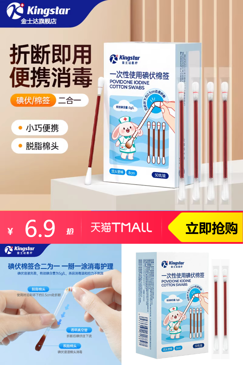 推荐:金士达医用碘伏棉签消毒碘酒棉棒50支