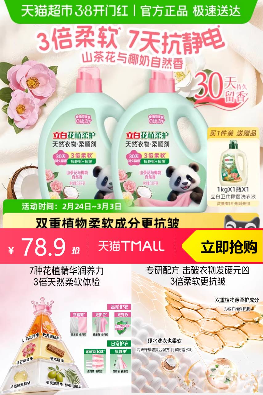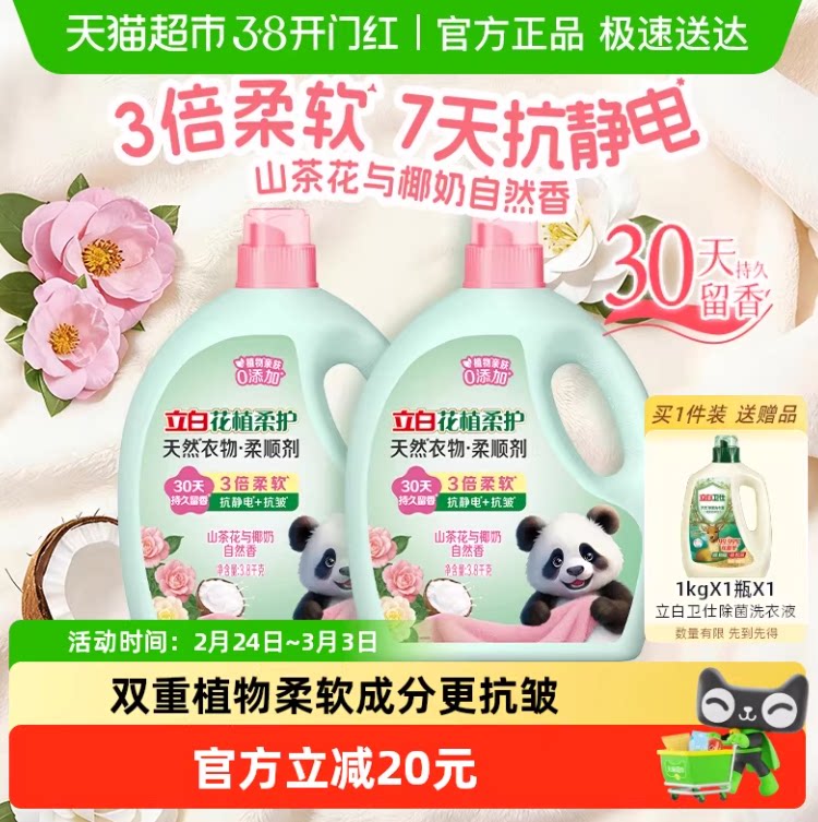 【1、叠加199-20 平台券抵扣9.8 2、88vip抵扣3.46 3、淘金币抵扣6.91 4、消费券抵扣7.25 5、猫超搜索立白品牌金 抵扣5块 最 低到手 46 平均2.6/斤】这款立白花植柔护柔顺剂,是您家庭洗衣的必备良品!它含有天然植物精华,有效呵护您的衣物,同时为衣物带来持久的柔软与光泽。