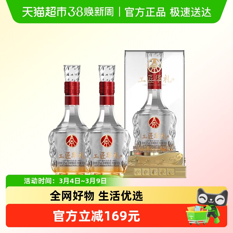 【精选礼品】工匠华礼五粮液集团出品浓香型白酒52度500ml*2瓶礼盒装,礼品,品质,适合各种场合赠送,如商务宴请、节日庆典等。精选优质原料,精心酿造,口感醇厚,回味悠长。无论是自用还是馈赠亲友,都是理想的选择。