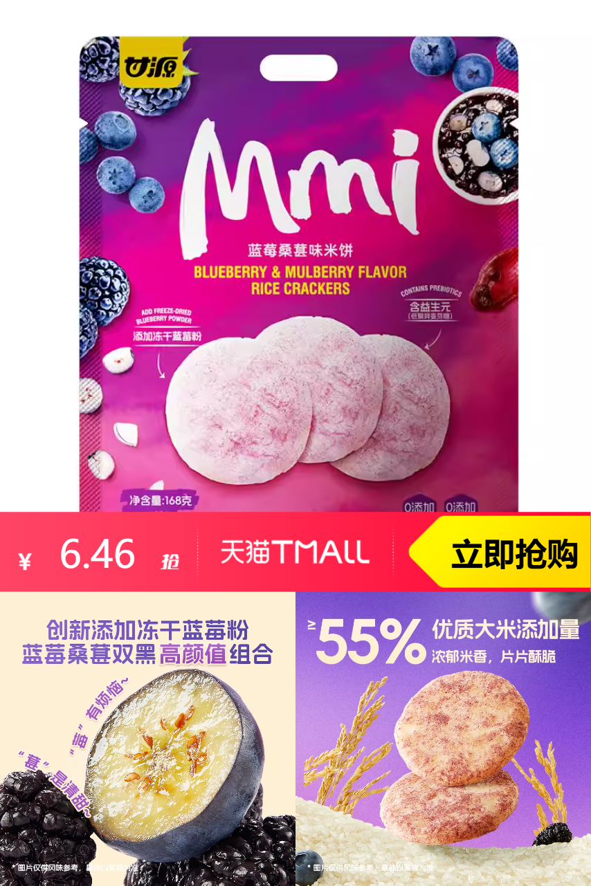 【原价9.9-红包3.44=到手价6.46元】甘源蓝莓桑葚味米饼益生元非油炸儿童零食,超赞!