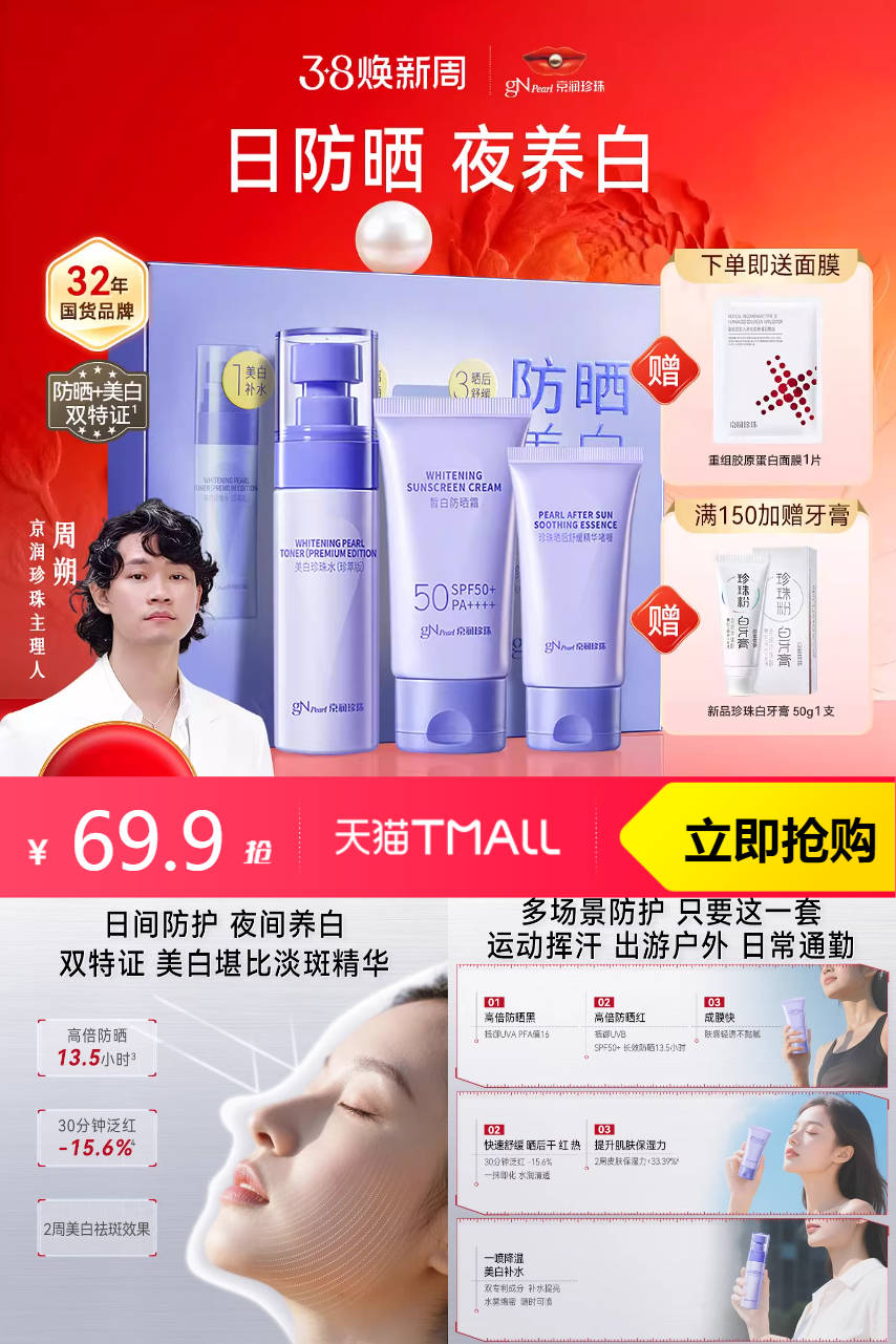 【原价69.9-淘金币1.39=68.51元-关注入会减5元=63.51元】京润珍珠美白防晒套盒SPF50+,全波段高倍防护,日夜养白舒缓,温和不刺激,适合敏感肌使用,有效阻隔紫外线,预防晒黑晒老,守护肌肤健康!