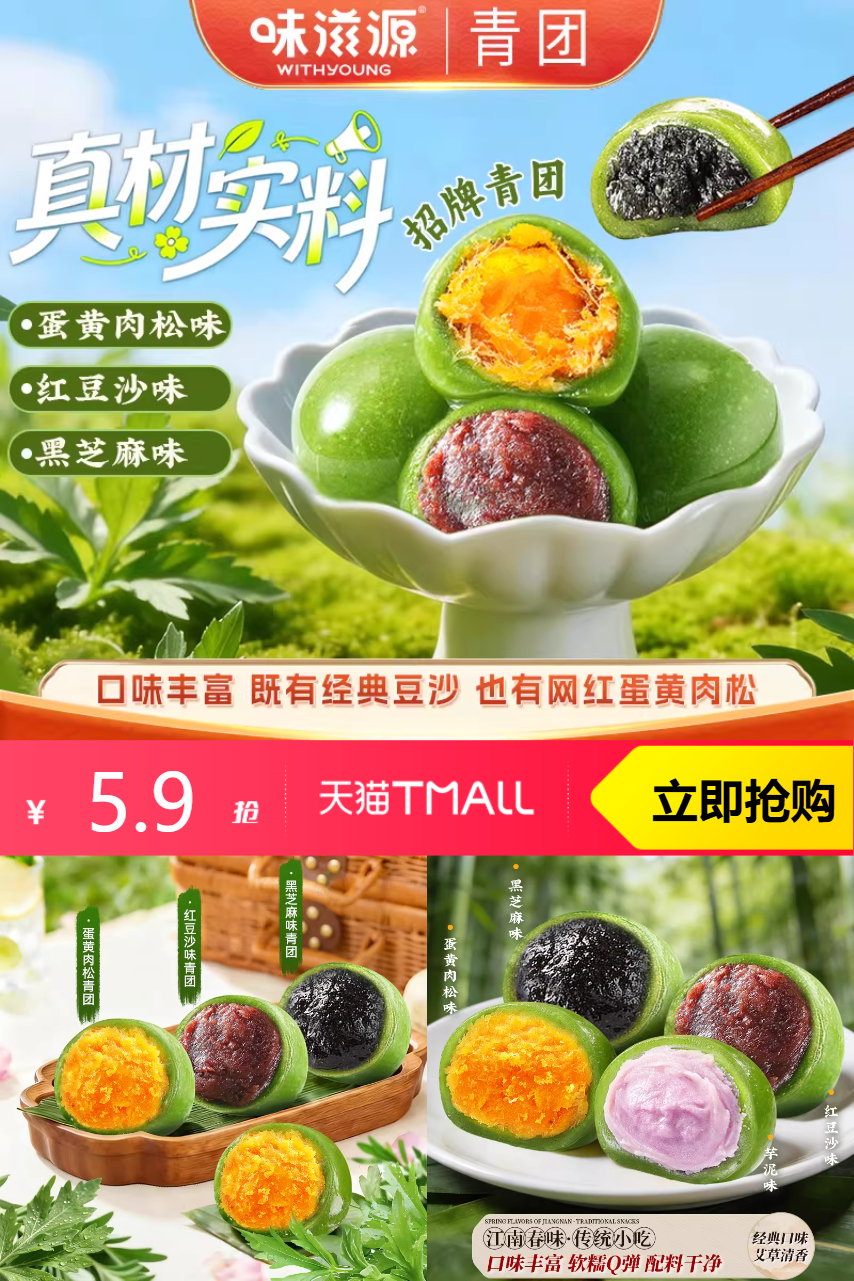 【淘金币抵扣0.3,到手5.5左右,超值!!!!】软糯拉丝的青团新吃法!这款味滋源青团融合传统与创新,外皮采用清香糯米皮包裹多重馅料,内含经典豆沙、咸香蛋黄与酥脆肉松,搭配Q弹麻薯,口感层次丰富。糯叽叽的质地让人一口爱上,是安徽合肥特色风味小吃的理想代表。独立小包装方便携带,适合作为下午茶点心或伴手礼,满足对传统糕点与新式口味的双重期待。