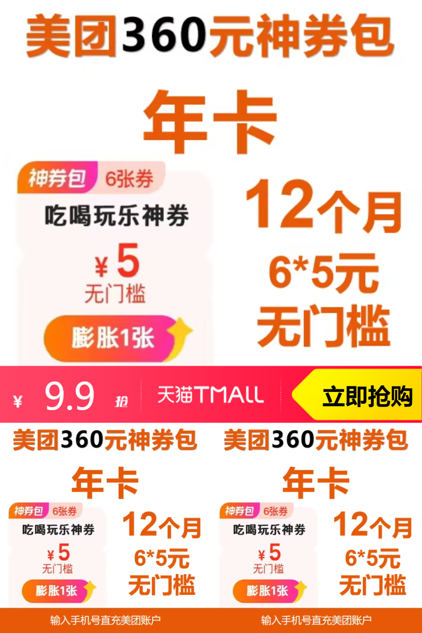 美团360元神券包年卡,就是您省钱的利器!我们的产品,是您一年内无忧用餐的保障! 从开通的那刻起,就能轻松拥有满满的折扣优惠,拯救您的餐费焦虑。 一张神券,每天带给您新的惊喜。涵盖多家合作餐饮店铺,囊括中餐、西餐、火锅、日料等各种菜系。只要出示您的神券,便能够尽享各类美食。超值体验不容错过哦!