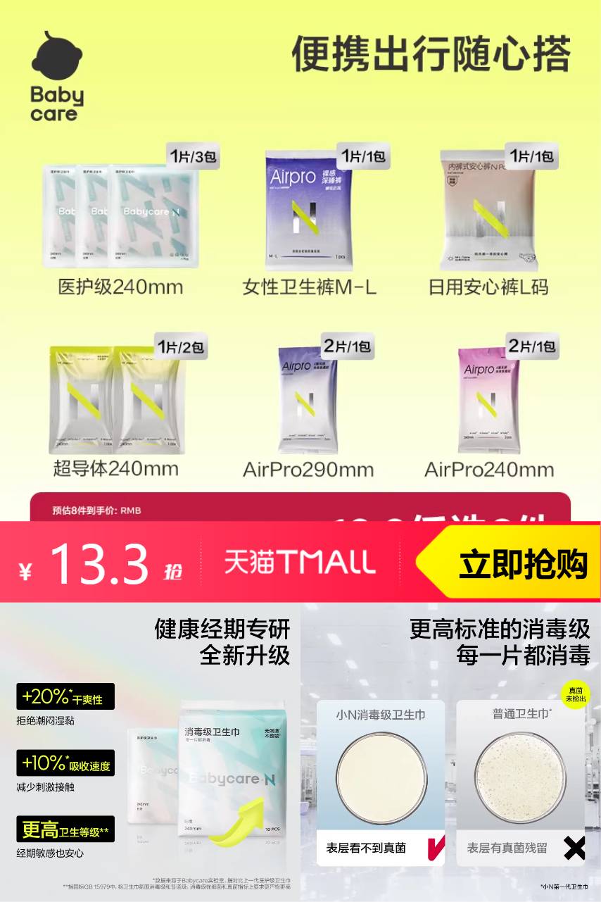 【任选拍8件到手14.92,叠加1.62淘金币到手13.3,均价一件才1.6!!!超划算可选安睡裤、多尺码卫生巾等】babycare医护级卫生巾日夜用姨妈巾医用薄款防漏组合装产妇正品医护,医护级别无刺激,不致敏,更卫生更安心
