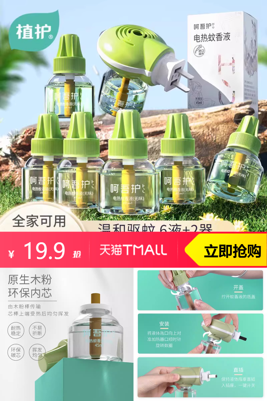 【拍4+1的选项! 叠淘金币+ 单品券+ 拍立减到手约19左右 !】植护插电热蚊香液 4液+1器,源于法国进口,守候温柔良夜!不含避蚊胺,温和配方,驱蚊不灭蚊!原生木粉,环保内芯,由木粉棒传输,芯棒上端受热后均匀挥发!采用恒温加热器,挥发更均匀!快来尝试植护插电热蚊香液吧!让您告别夏日烦恼,尽享舒适生活!