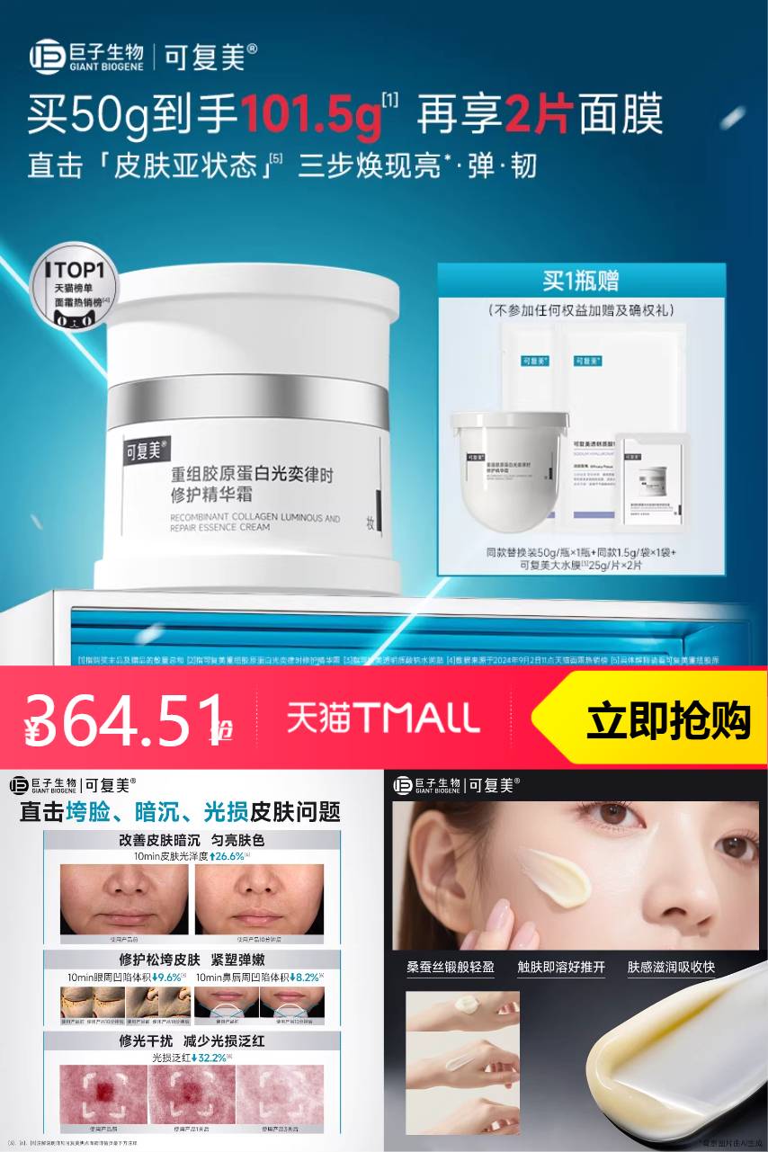 【1、加赠 同款1.5g/袋x1袋+可复美大水膜25g/片x2片 2、下拉百补 叠加金刚券抵扣 36.9 金币抵扣 4.49 直接到手327.61】独有的复原配方,赋予你的肌肤源源不断的生命力!采用纯天然成分,让你在护肤的同时感受自然的滋养!