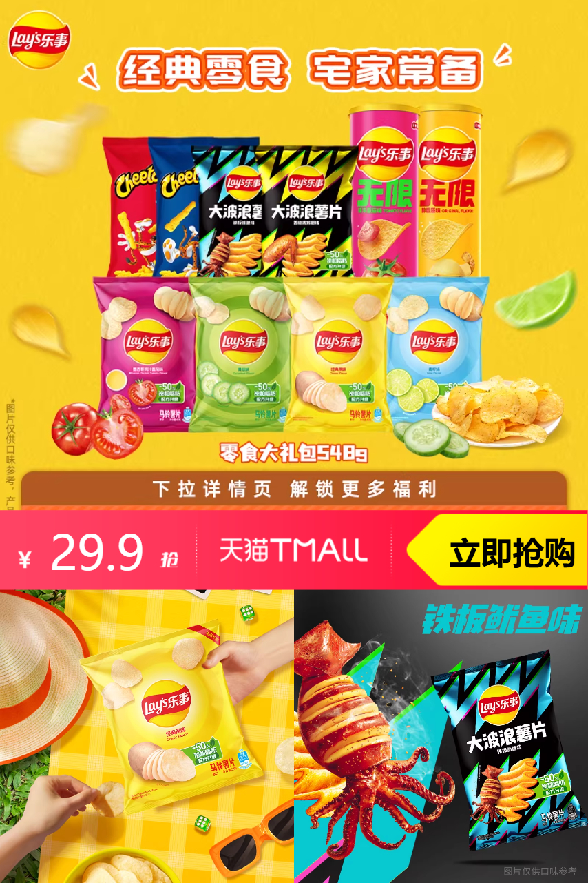 【淘金币抵扣 0.69,到手价29.21】乐事薯片零食大礼包548g,用心选择原料,层层严选制作工艺,确保每一个薯片都是口感纯正、健康安全。每一口都是对味蕾的呵护,更是对健康的追求。不论是家庭聚会还是休闲时光,乐事薯片都是你不可或缺的伴侣。无论老少咸宜,味道绝对让你难以忘怀!
