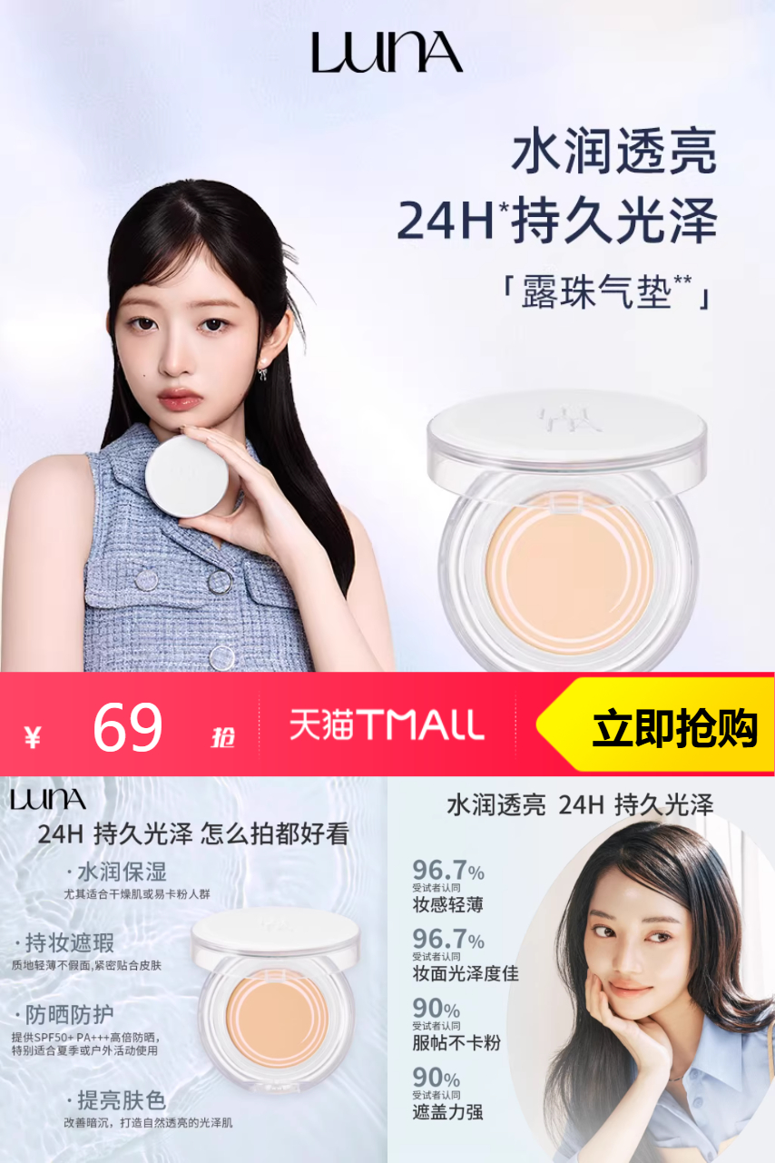 【单品券+ 立减后到手仅需69,单芯划34.5元!】韩国爱敬LUNA露娜露珠气垫*1壳两芯,清透露珠气垫,打造透亮洁净光彩肌!水润透亮,自然裸装感,轻透露珠气垫,更推荐干皮、混干皮选择,使用低刺激气垫,敏感肌不犹豫! 使用后,你会发现肌肤仿佛得到了重生,细纹、瑕疵一扫而光,展现出一个全新的你。轻盈的质地让肌肤呼吸自如,不会有厚重感。快来试试吧!