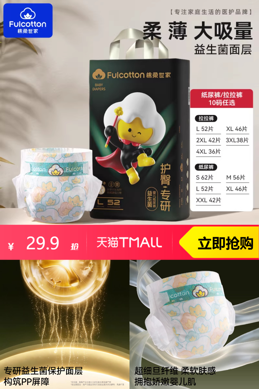 【淘金币可抵0.79,到手29.11】,棉柔世家益生菌系列纸尿裤超薄透气婴儿男女宝宝尿不湿新生儿尿片