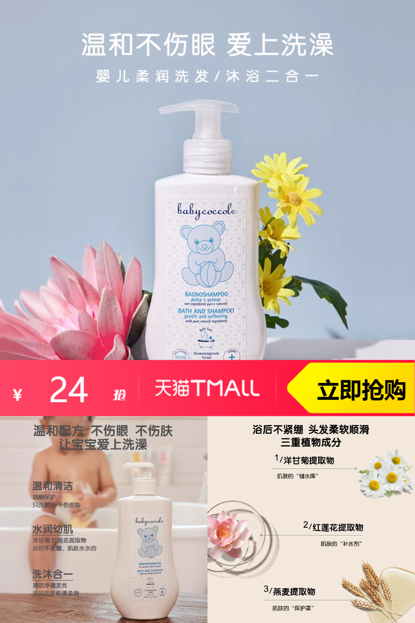 【淘金币减13.4元,到手10.6元】宝贝可可丽婴儿洗发沐浴二合一250ml,意大利进口,专为3-15岁宝宝设计!BabyCoccole温和滋养配方,弱酸性pH5.5配方,无泪不刺激,温和洁净宝宝娇嫩肌。特别适合新生儿及敏感肌肤的宝宝使用。宝妈们可以安心信赖宝贝可可丽,享受它带给宝宝的每一次清洁和舒适。