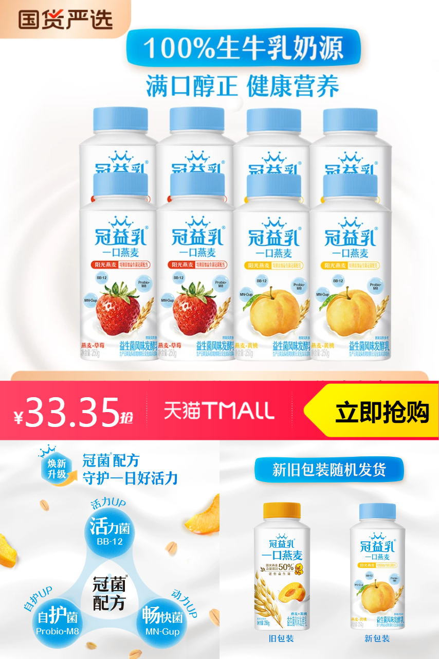 【原价59.9-限时补贴26.55-淘金币0.59-消费券4.04元=到手28.72元】冠益乳低温燕麦酸奶黄桃+草莓味,双味组合营养丰富,快来抢购!超赞~