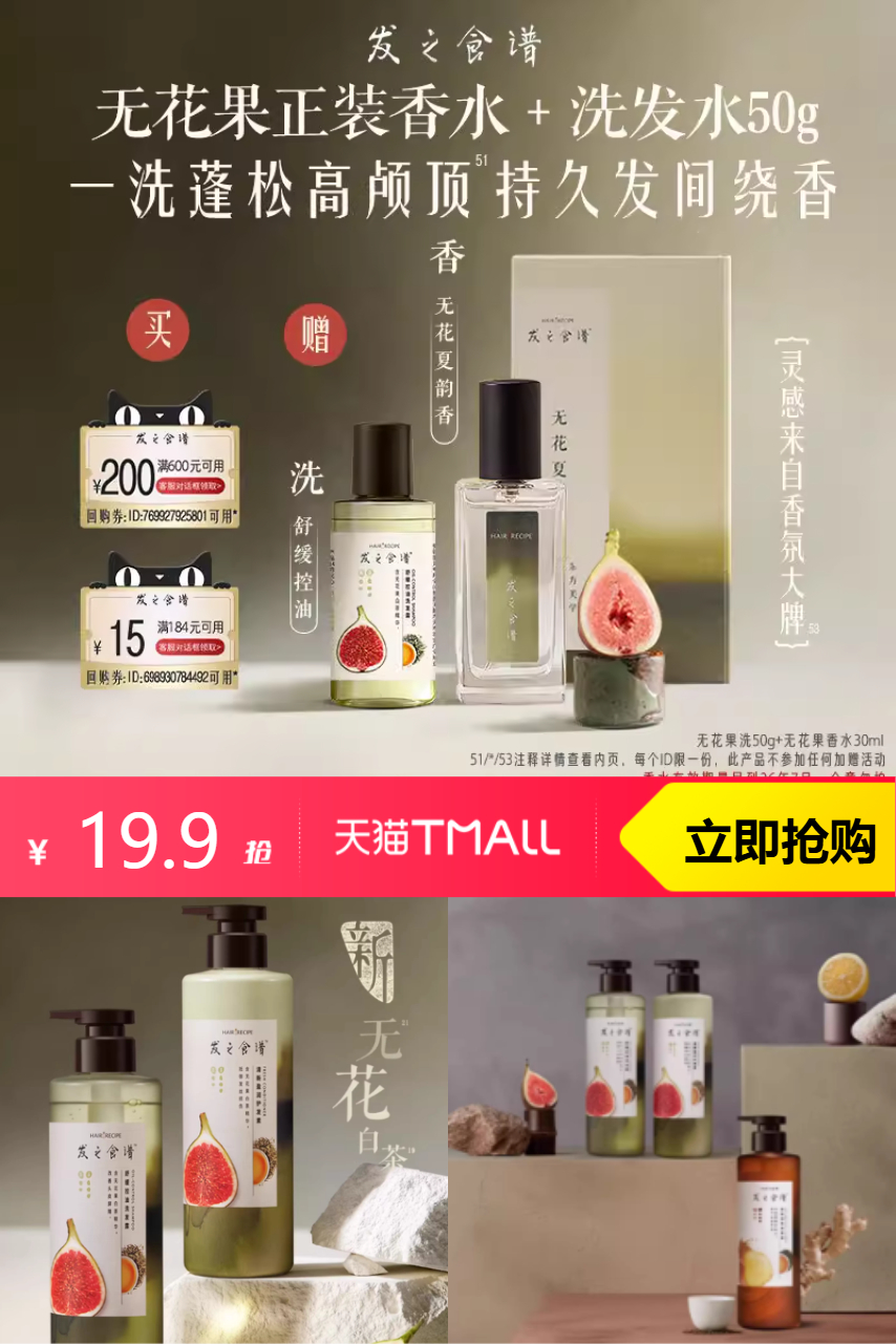 【淘客券20,实际到手19.9】发之食谱无花果香水30g+无花果洗50g,一疏一补,帮助平衡头皮微生态,养出健康蓬松发!3大无添加,轻盈质地,温和净澈!无论是香水还是洗发水,都含有丰富的无花果精华,滋养秀发,让你的头发如丝般柔顺。快来尝试这款发之食谱无花果香水与洗发水套装吧!