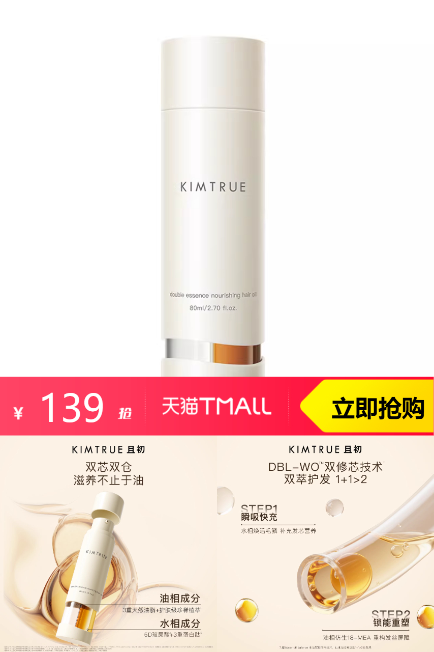 【加赠:双萃3ml*2】立减22+淘金币21.72+限时店铺11元红包+会员1.81后到手80ml约94元;买就赠双萃3ml*2;共86ml!!KIMTRUE且初双萃护发精油,水油双萃7天重塑发质健康,双芯双仓,滋养不止于油,瞬吸快充,水相焕活毛鳞,补充发芯营养!!快来试试吧!!