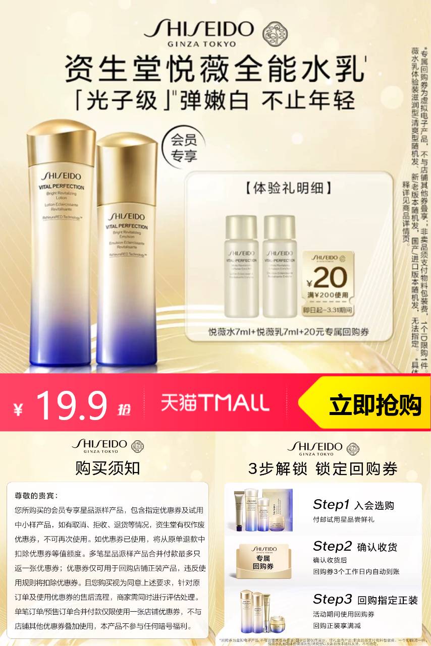 【淘金币可抵】打开资生堂悦薇水乳,感受如丝般顺滑的质地,清爽不油腻,轻松被肌肤吸收。