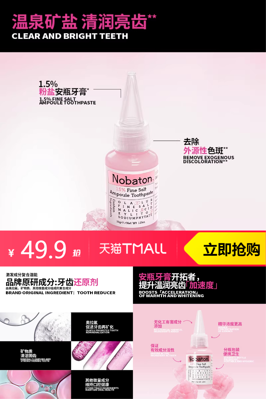 【叠加淘金币1.79元,到手48.11元,买即赠果酸漱口水30ml】诺巴顿农场粉盐安瓶牙齿敏感亮白含氟牙膏,温泉矿盐,清润亮齿。