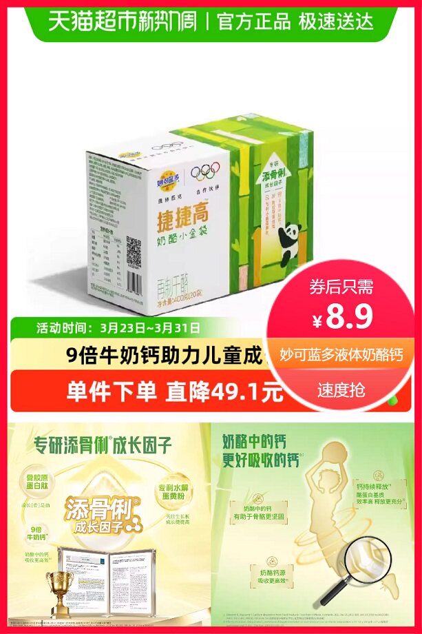 直降49.1元+券70元+淘金币省1元+88vip省0.5元后约8.4元,妙可蓝多捷捷高液体奶酪钙,不加一滴水,9倍牛奶钙,20g*20条小金袋,奶酪中的钙,更易吸收,0添加,经得起考验!