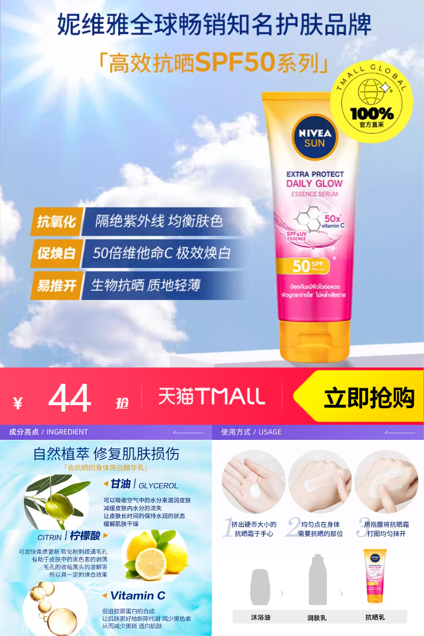【下拉详情页淘金币补贴0.98元,180ml的规格88vip到手41元】妮维雅防晒霜180ml,无惧光老,晒出光采。