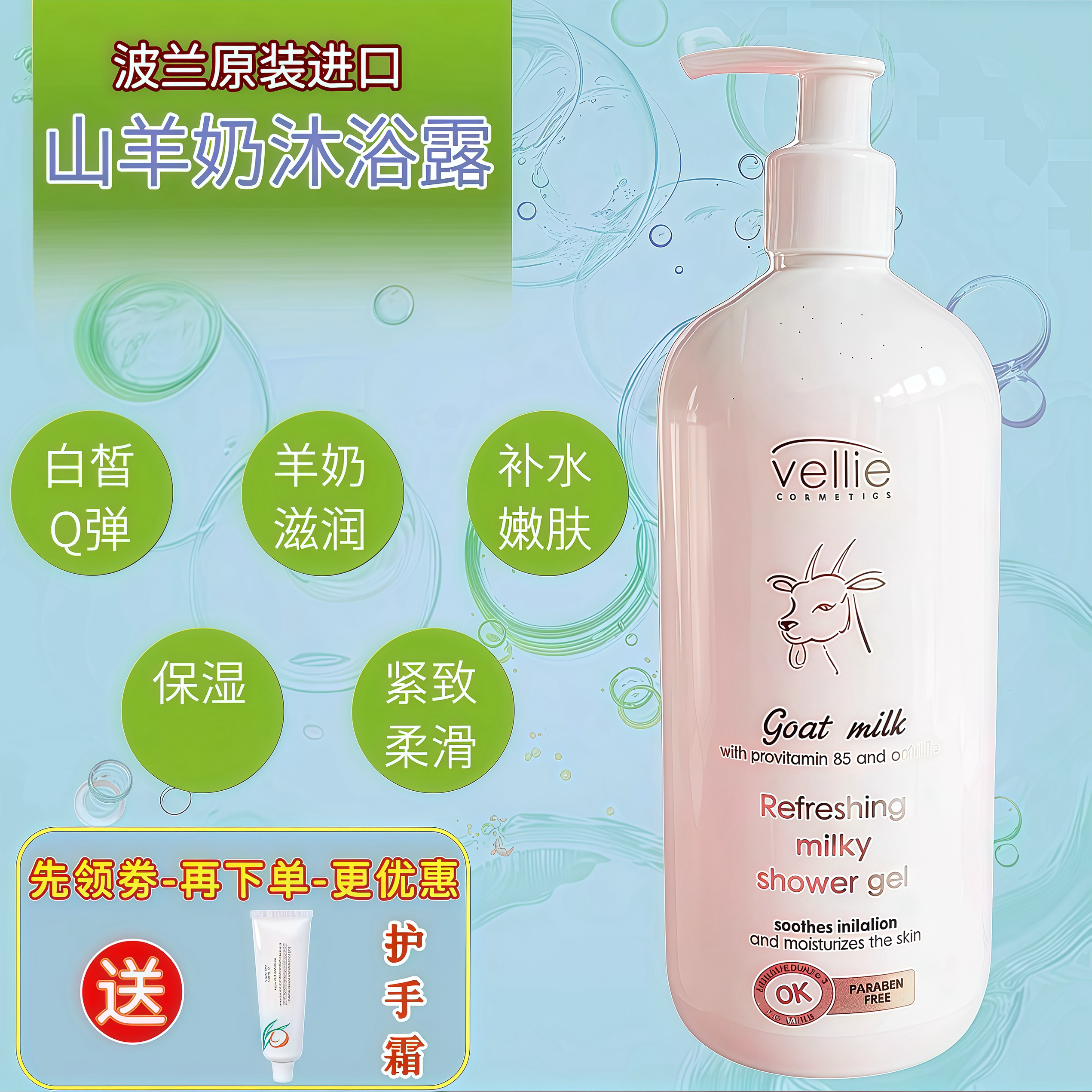 波兰vellie珐埃莉山羊奶沐浴露,白净保湿滋润润肤止痕痒补水健康,是您肌肤的佳选择。