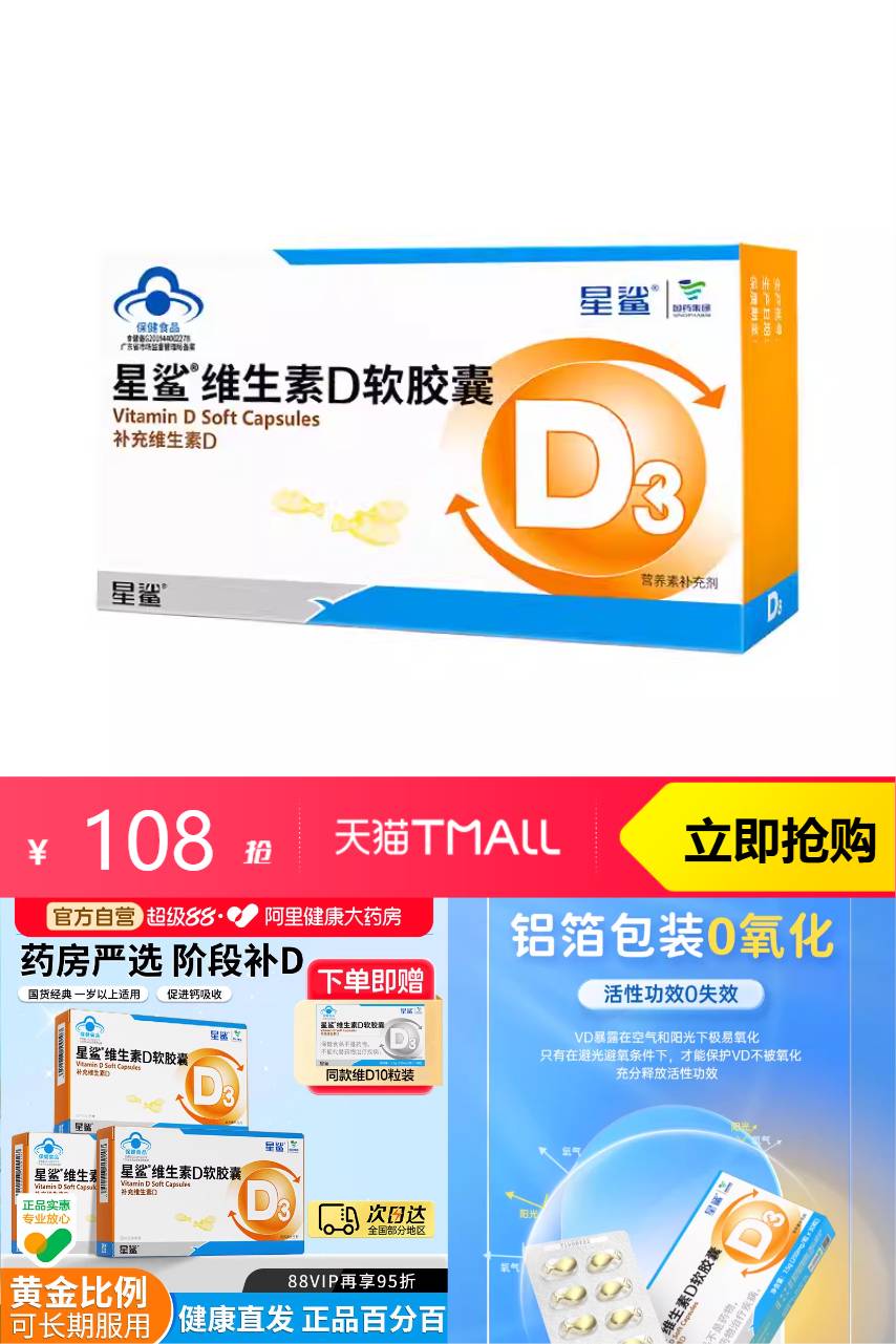 【拍6送6盒10粒装,健康惊喜直降10元,淘金币抵扣16元,88vip专享9.5折抵扣4.9元,消费券200-25元抵扣7.7元,到手价69.3元】星鲨维生素D滴剂软胶囊D3维D婴幼儿宝宝补钙儿童青少年补充VD30粒,因为维生素D是促进钙吸收的重要元素,它让我们的骨骼更加强壮,免疫力也大大提升。