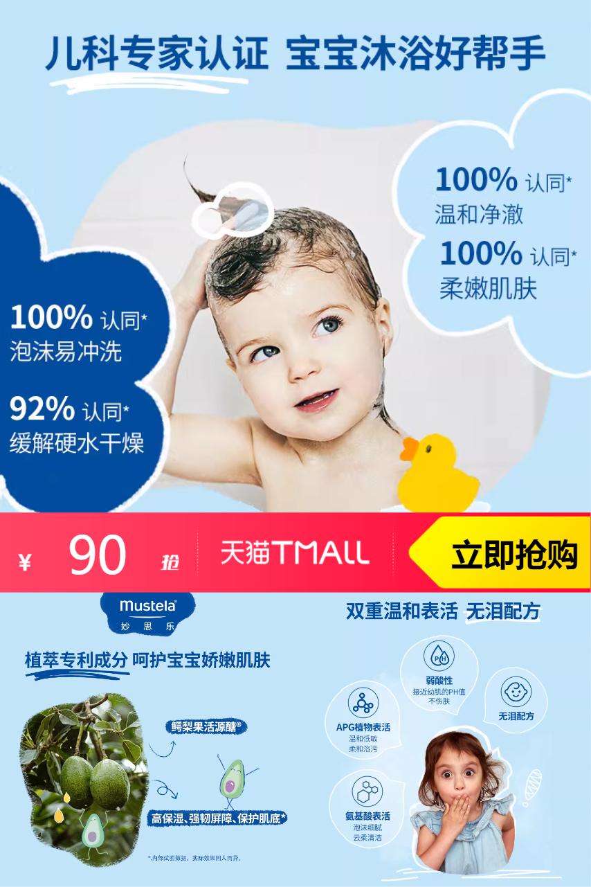 【拍500ml送50ml*8小装!共900ml!海外原装进口效期好!活动价300-官方立减30-单品立减115-加入会员立减24-淘客券41=90元!】mustela儿童温和洗发水沐浴露二合一,宝宝沐浴好帮手。